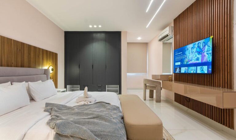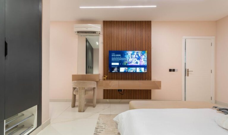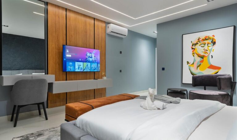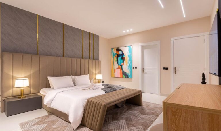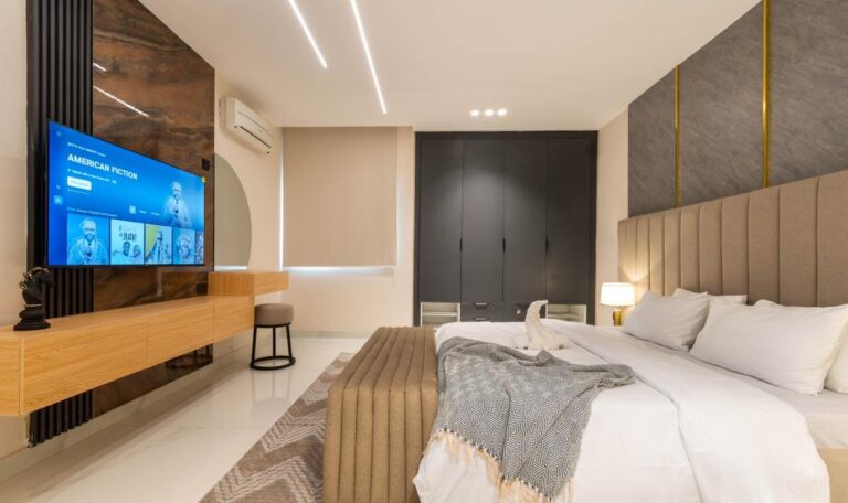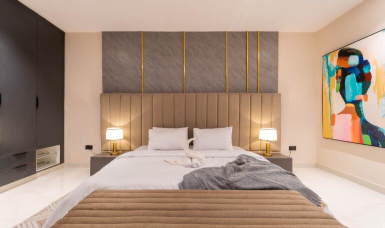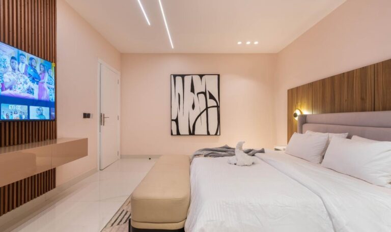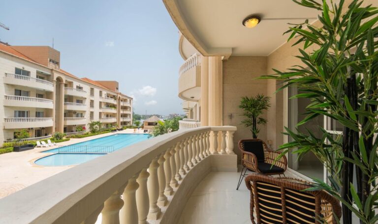 Luxury 2 Bedroom Apartment in Lekki Phase 1: Fully fitted kitchen, balcony, 24/7 power & security, WiFi, Netflix, pool, gym, cinema, waterfront view.